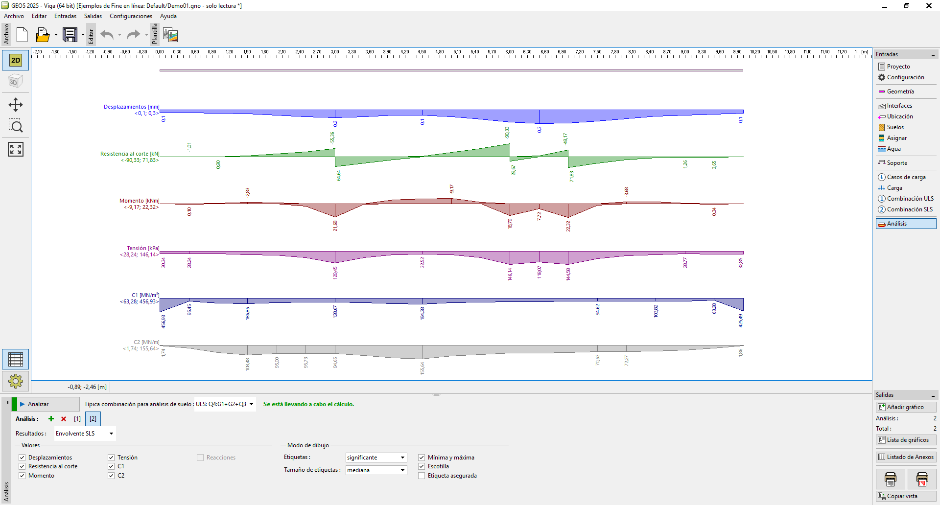 El resultado del análisis se muestra en el cuadro "Verificación". El Análisis se lleva a cabo utilizando el método de elemento finito incorporado en el subsuelo Winkler-Pasternak. Varios análisis, incluyendo los resultados, pueden ser llevados a cabo en una sola tarea. Más información acerca del resultado del análisis se muestra en la esquina superior derecha del cuadro. Si se cambian los parámetros de análisis es necesario volver a correr el análisis presionando el botón "Analizar".