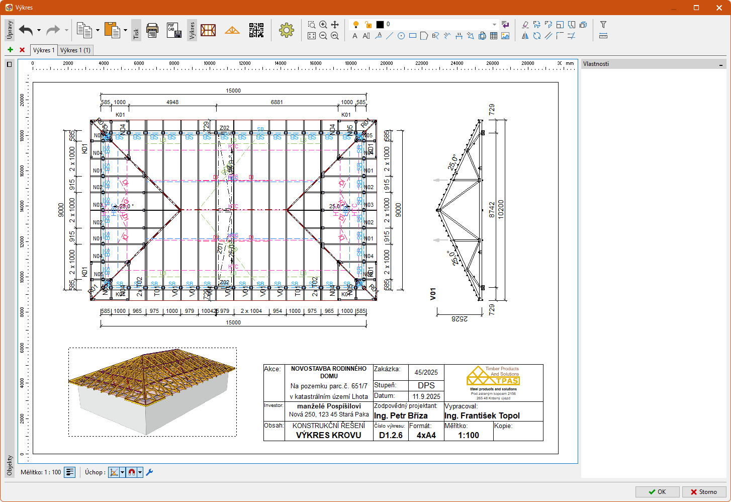 • Vložit vazník - umožňuje vložení výkresu vazníku, opět s možností kótování. Výběr typu vazníku probíhá v okně s vlastnostmi bloku, a to buď za pomoci seznamu vazníků nebo kliknutím v půdorysu