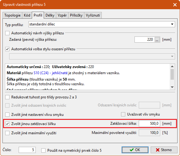 Ve "Vlastnostech dílce" na záložce "Profil" je možné zadat zatěžovací šířku, která bude pro daný dílec použita místo zatěžovací šířky vazníku.