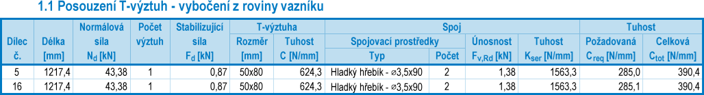 V dokumentu "Statický výpočet" je možné zapnout v části "Posouzení dílců" položku "T-výztuhy". Tato položka přidá do dokumentu tabulku, v které lze nalézt hlavní vstupy a výsledky posudku T-výztuh. Jedná se především o návrhovou stabilizující sílu, rozměr a tuhost T-výztuhy, parametry spoje a nakonec též celková a požadovaná tuhost prvku.
