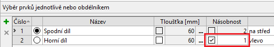 Možnost zadat násobnost a tloušťku pro jednotlivé výrobní části