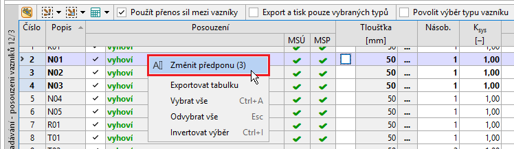 V programu "Truss 3D" je možné v části "Výsledky" hromadně přejmenovat vybrané vazníky. Pomůcka "Změnit předponu" pro přejmenování je umístěna v kontextovém menu tabulky vazníků. Více typů vazníků lze vybrat kliknutím do prvního sloupce tabulky nebo graficky na ploše, pokud je zapnuté nastavení "Povolit výběr typu vazníku". Po výběru pomůcky je možné zadat v samostatném okně novou předponu vazníků. Pomůcku lze použít pouze na automaticky číslované vazníky, vazníky s "vlastním" popisem zůstávají beze změn.