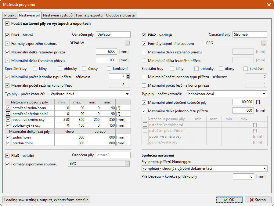 • Toto nastavení slouží ke zpřístupnění limitů, které jsou závislé na konstrukčním řešení pily. K dispozici jsou dvě varianty: "jednokotoučová" pila je nejčastější řešení pro CNC pily. U této varianty je možné zadat limitní úhel natočení kotouče. Hodnota představuje kolmý řez, hodnota 90° pak řez rovnoběžný s osou dílce. "čtyřkotoučová" pila umožňuje zadat limity pro jednotlivé kotouče samostatně, zároveň je možné definovat limitní hodnoty vzájemných posunů.