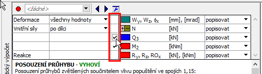 Zaškrtávací políčka pro zobrazení jednotlivých vnitřních sil a deformací