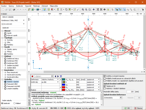 V tomto režimu lze zobrazit průběhy vnitřních sil a deformací a též výsledky posouzení průhybu vazníku.