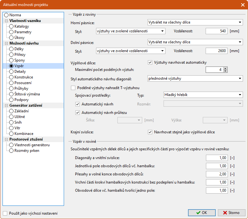Pro "Horní pásnice" a "Dolní pásnice" (do kterých jsou zařazeny i hambalky) je možné zvolit, zda se mají podélné výztuhy bránící vybočení vkládat vždy ("Vkládat na všechny dílce") nebo pouze na dílce, které jsou namáhané tlakovými silami "Vytvářet pouze na tlačené dílce"). Následně je možné zvolit styl vkládání výztuh: