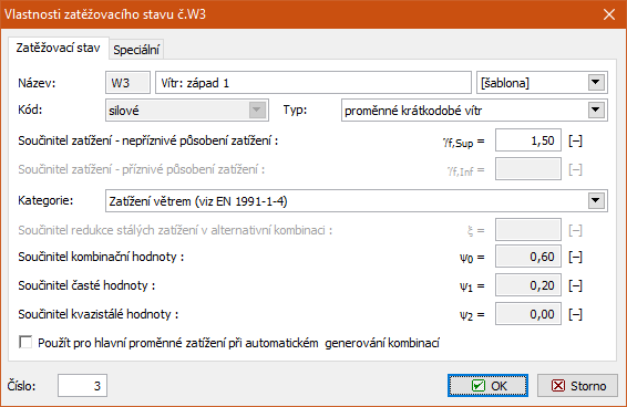 Zatřídění zatěžovacích stavů do kategorií odpovídá klasifikaci zatížení dle zvolené návrhové normy. Dle tohoto zatřídění jsou proměnným zatěžovacím stavům přiřazeny kombinační součinitele. Kategorie "Uživatelské zadání" umožňuje zadání vlastních hodnot součinitelů.