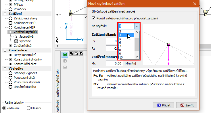 Zatížení styčníků se vkládá a upravuje pomocí nástrojů ve svislé liště u tabulky zatížení, která se zobrazuje ve spodním zadávacím rámu. Pro práci se zatížením jsou k dispozici nástroje "Přidat", "Upravit" a "Odstranit" v nástrojové liště na levé straně tabulky. Při vkládání nového zatížení se v okně "Nové zatížení styčníku" zadává nejenom velikost zatížení, ale též číslo styčníku, kterému bude zatížení přiřazeno. Vložení zatížení do konstrukce se provede tlačítkem "Přidat". Po dokončení zadávání zatížení se okno ukončí tlačítkem "Zavřít".