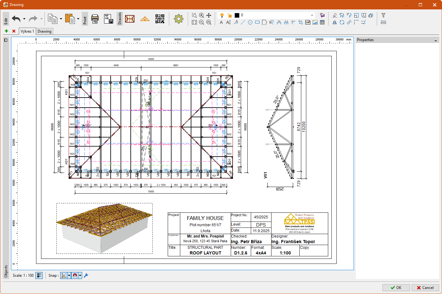 The "Drawing Editor" tool for creating drawings has been added to the "Truss 3D" program. It is a separate window in which users can create drawings and print or export them. When creating drawings, it is possible to combine automatic blocks (roof layout, drawings of individual trusses) and other drawing tools known from previous versions of the program (lines, text, blocks, images, etc.).