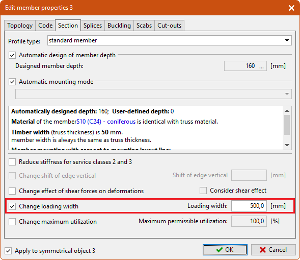 In the "Member Properties" on the "Profile" tab, you can enter the loading width that will be used for the given member instead of the global loading width.