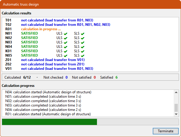 For better orientation during the design process, the information displayed during automatic truss design in the "Truss 3D" program has been expanded. In addition to an overview of the current status of the calculated trusses, dependencies based on load transfer are also listed.