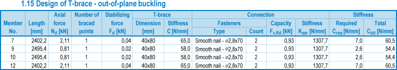 In the "Structural analysis" document, it is possible to enable the "T-braces" item in the "Member analysis" section. This item adds a table to the document containing the main inputs and results of the T-brace analysis. These include, in particular, the design value of stabilizing force, the dimensions and stiffness of the T-brace, the connection parameters, and finally the total and required stiffness of the whole system.