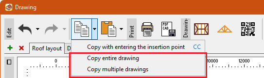 The "Drawing Editor" can manage multiple drawings with different scales and formats. Drawings can be inserted and deleted using the buttons next to the drawing tabs. Tools for copying drawings are located in the drop-down list next to the "Copy to Clipboard" command. Drawings can be copied both within a single project and between projects. After this operation, all automatic blocks (roof layouts, trusses, etc.) are automatically updated.