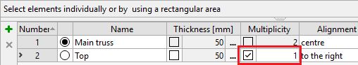 For individual production parts, it is possible to specify a different multiplicity or timber thickness than that specified for the entire truss. Thanks to this adjustment, it is possible, for example, to produce the main load-bearing part as 2-ply and the secondary part as single, or to reinforce the truss using timber that does not correspond to the truss production range.