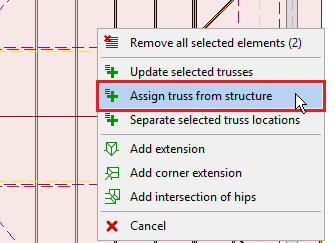 If any truss locations are selected in the "Truss 3D" program, they can be changed to a different type using the "Assign truss from structure" command, which is located in the context menu of the workspace.