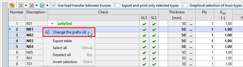 In the "Truss 3D" program, it is possible to rename selected trusses in bulk in the "Results" section. The "Change prefix" tool for renaming is located in the context menu of the truss table. Multiple truss types can be selected by clicking on the first column of the table or graphically on the desktop if the "Graphical selection of truss types" setting is enabled. After selecting the tool, you can enter a new truss prefix in a separate window. The tool can only be used on automatically numbered trusses; trusses with a "custom" description remain unchanged.