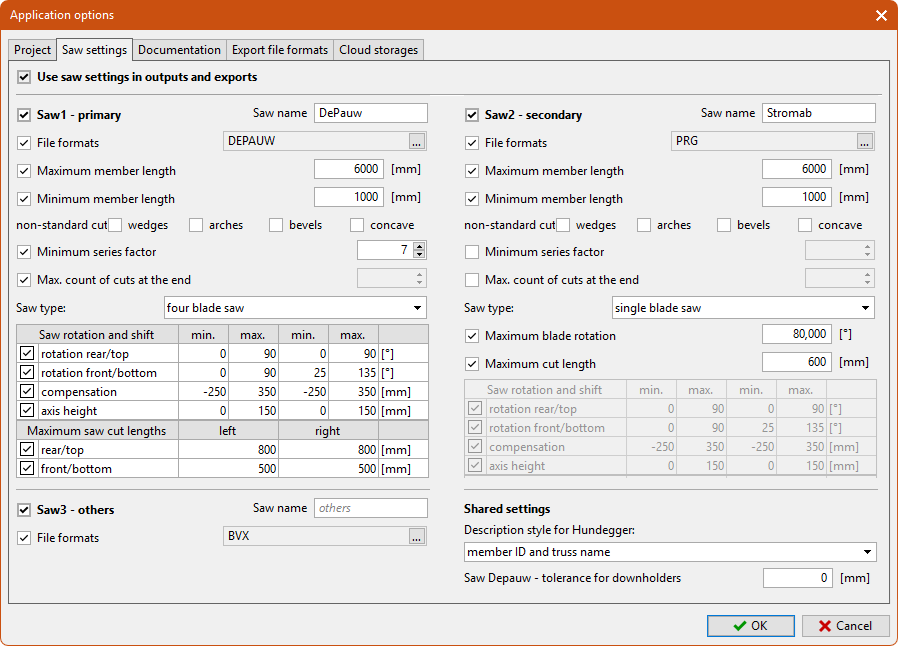 The cutting list can be processed by a single saw or divided into up to three lists for different machines. For these cases, the settings on this tab are divided into three sections: "Saw1", "Saw2", and "Saw3". If we are using only one saw, we can use any of these three options for these needs. If we combine multiple machines, the program first tries to assign each cut to the "Saw1" list. If the cut does not meet the specified limiting parameters (repeatability, limit angle, etc.), the program checks whether the cut meets the conditions defined in the "Saw2" section. If these criteria are not met either, the cut will be included in the "Saw3" list. For the "Saw3" device, only the output file can be selected; it does not contain any limiting criteria for the geometry of the members. "Saw3" should also be used in cases where we have one CNC saw with geometric restrictions (minimum part length, etc.) and members with unsuitable geometry are cut manually. In these cases, we enter the CNC saw as "Saw1" or "Saw2" and check the "Saw3" item without selecting an output file for it. The program then simply divides the cutting list into two parts and creates only documentation without a control file for the "Saw3" list.
